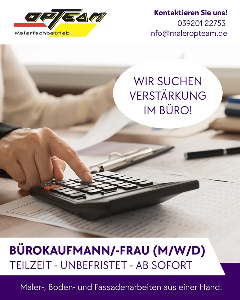 Bei der Opteam Malerfachbetrieb GmbH steht Teamarbeit im Mittelpunkt. Als modernes Handwerksunternehmen mit familiärem Miteinander suchen wir eine engagierte Person, die unser Büro-Team zuverlässig unterstützt und den organisatorischen Ablauf im Hintergrund mitgestaltet.